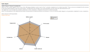 As part of the multisource feedback procedure, a host of different people working alongside the professional will be invited to provide feedback on the professionals’ performance by completing an evaluation form. The professional himself completes a self-evaluation form. As soon as this multisource feedback round has closed, the statistical results of the self-evaluation will be compared with those of all the other evaluations and automatically presented in a radar chart as well as displayed numerically and organised in a so-called feedback report in the form of anonymous, written descriptions. Afbeeldingen: rapport, spinnenweb